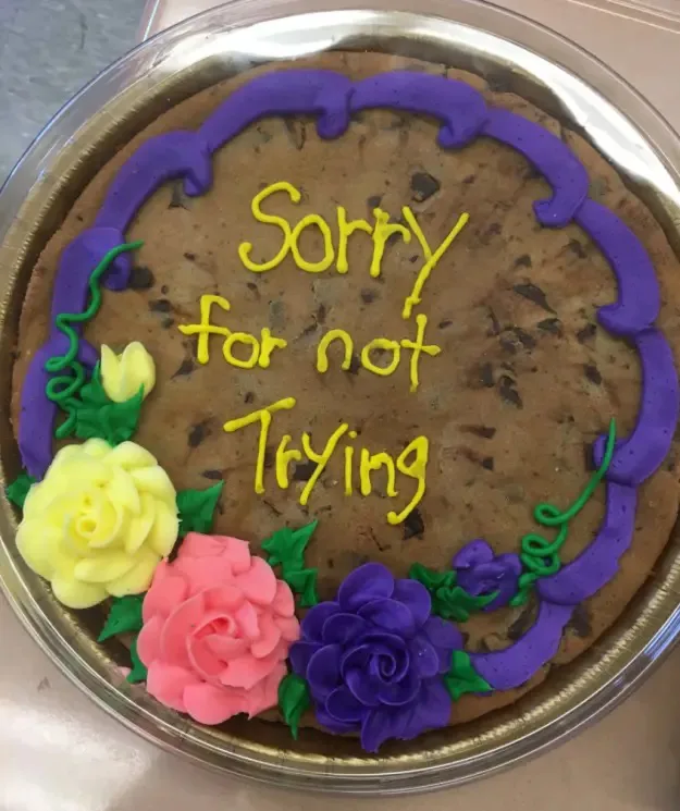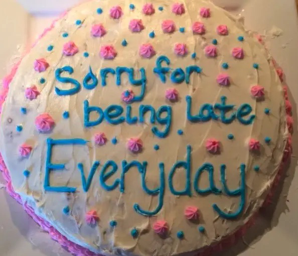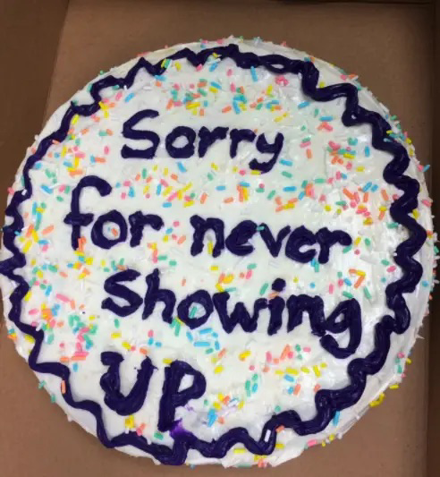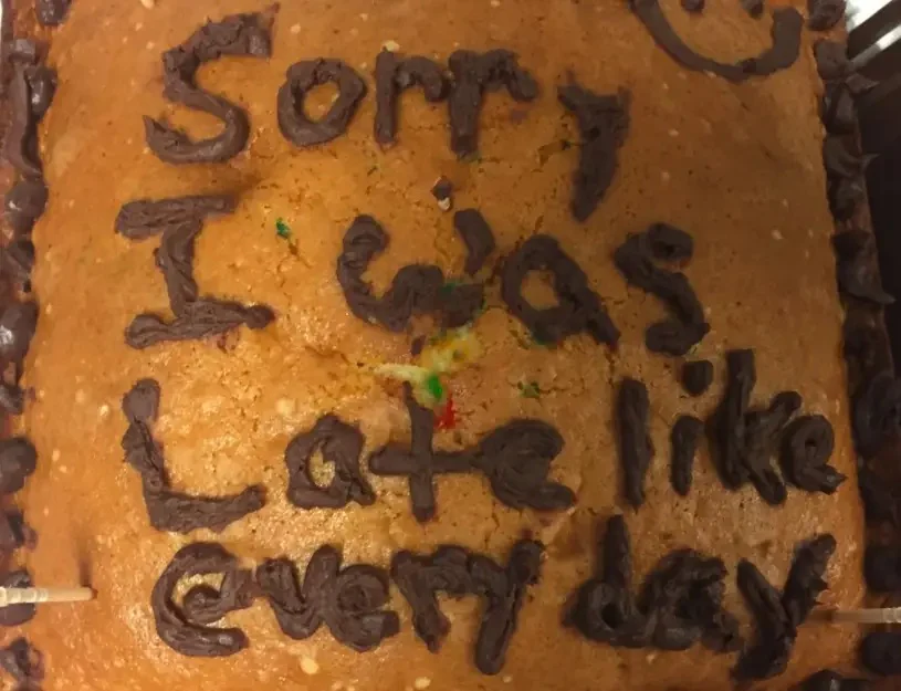 The quality of this homemade cake suggests the giver doesn’t actually feel sorry for their chronic tardiness at all. Take it home and feed it to your dog.
