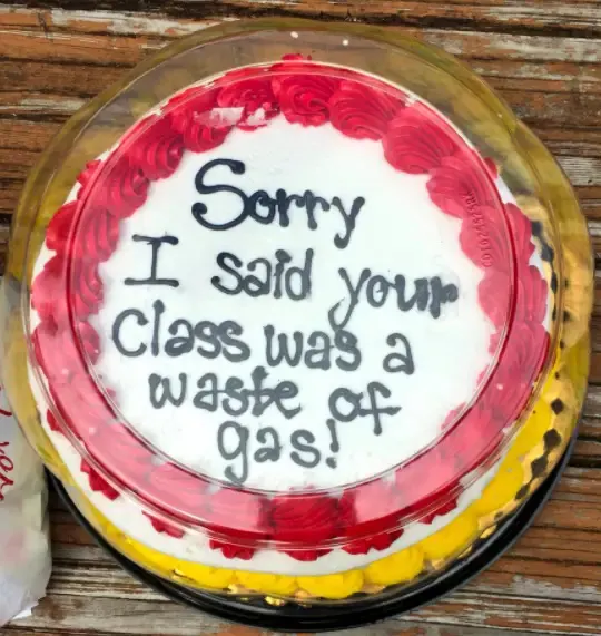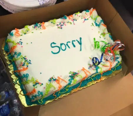 This student acknowledges that they are so problematic in so many ways that they won’t even try to put it into words. A bakery cake that merely says “sorry” might be enough for a little redemption.