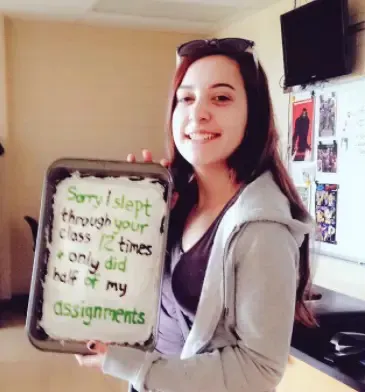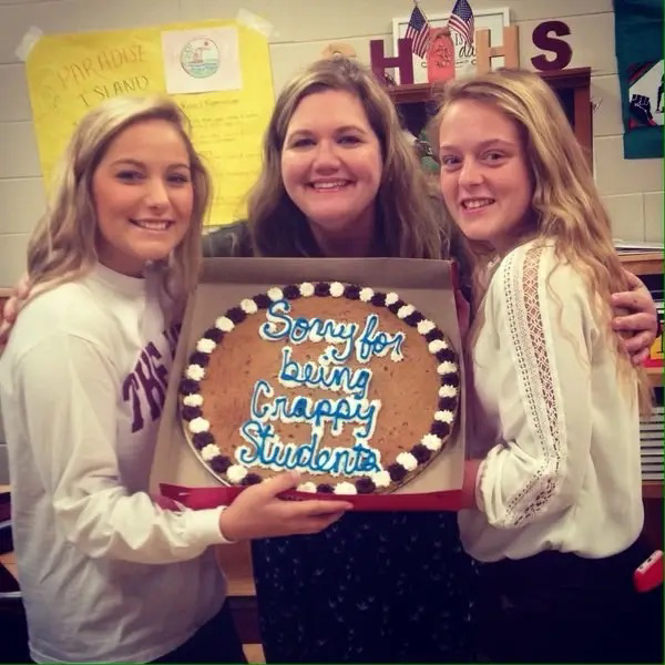 These students purchased their teacher a gigantic cookie to acknowledge that their performance as students just didn’t cut it. They present the cookie with pride, and the teacher is so happy to have received a gift that she is genuinely smiling as well.