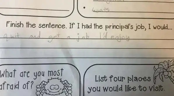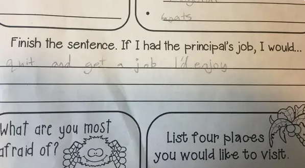 I’ll bet the teacher was looking for a more wholesome answer, but this kid is honest in his response and probably accurately represents the principals deep desires as well.